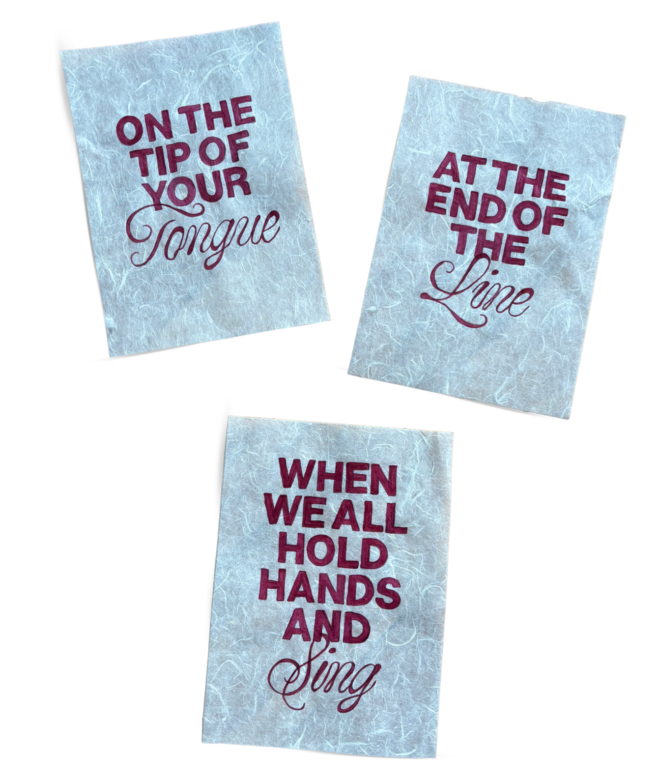 Hand-painted series of posters created with homemade hibiscus paint on rice paper. The posters can be layered on top of different colored backgrounds or in front of windows or lights for an illuminated glow.